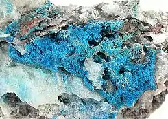 Suele encontrarse asociado a otros minerales como: auricalcita, shattuckita, ajoíta, barita o cuarzo.