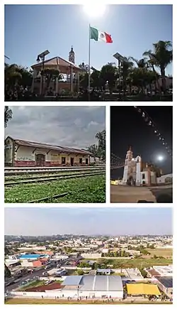 ![]() De arriba abajo de izquierda a derecha: Zócalo, Estación Panzacola, Parroquia de San Francisco Papalotla, y Panorámica de la ciudad.