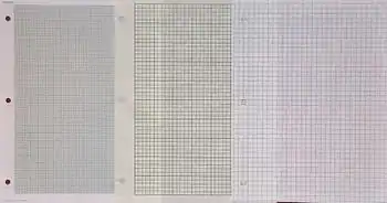 - Papel de ingeniería (o un bloc de ingeniería cuando viene en forma de cuaderno),[6] se imprime tradicionalmente en papel translúcido de color verde claro o tostado. Puede tener cuatro, cinco o diez cuadrados por pulgada. Las líneas de la cuadrícula están impresas en el reverso de cada página y se ven tenuemente en el anverso. Cada página tiene un margen sin imprimir. Cuando se fotocopia o escanea, las líneas de la cuadrícula normalmente no aparecen en la copia resultante, lo que a menudo le da al trabajo una apariencia ordenada y despejada. En los EE. UU. y Canadá, algunos profesores de ingeniería requieren que el estudiante completen determinados trabajos en papel de ingeniería.[6][7]