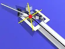 La junta universal o cardán es una serie de dos juntas rotativas. La segunda superficie de contacto de cada una de las dos juntas se encuentra en la pieza intermedia común en forma de cruz (ver figura de la derecha). Los ejes de las juntas giratorias se cortan a 90°. El punto de intersección es el punto de pivote en el que los dos "vástagos" de articulación dispuestos en ángulo recto con respecto al eje de articulación de pivote respectivo pueden pivotar entre sí. La articulación cardánica tiene dos grados de libertad de movimiento. En comparación con la rótula, carece de la libertad de rotación de los vástagos de la articulación alrededor de su propio eje. Su grado de libertad es f=2.