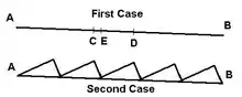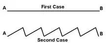 Considere un ejemplo en el que hay dos puntos A y B que tienen la misma altitud, como se muestra en la Figura 1. En el primer caso, tenemos un perfil plano que los conecta. Aquí, si dejamos algunas canicas redondas en el medio que se mueven hacia adelante y hacia atrás de forma aleatoria, rodarán aleatoriamente pero hacia ambos extremos con la misma probabilidad. Ahora considere el segundo caso en el que tenemos una región similar a un diente de sierra entre ellos. Aquí también, las canicas rodarán hacia ambos extremos con la misma probabilidad (si hubiera una tendencia a moverse en una dirección, las canicas en un anillo de esta forma tenderían a extraer energía térmica de manera espontánea para girar, violando la segunda ley de la termodinámica). Ahora bien, si inclinamos todo el perfil hacia la derecha, como se muestra en la Figura 2, está bastante claro que ambos casos se inclinarán hacia B.