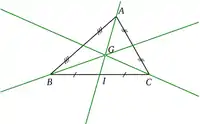 • Cada mediana divide al triángulo en dos triángulos, siendo lado común de ellos; dichos triángulos, en general, no son congruentes; pero sí equivalentes, de igual área, por ejemplo para el caso de la mediana AI (véase la figura) dichas regiones son los dos triángulos ΔABI y ΔACI de igual área.