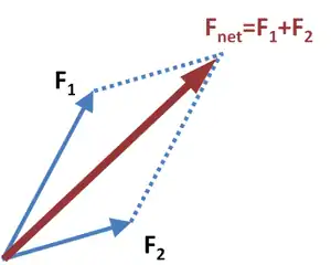 Supóngase que dos fuerzas actúan sobre una partícula en el origen (las "colas" de los vectores) de la Figura 1. Hágase que las longitudes de los vectores F1 y F2 representen las velocidades que dos fuerzas podrían producir en la partícula actuando durante un tiempo dado, y hágase también que la dirección de cada una represente la dirección en la que actúan. Cada fuerza actúa independientemente y producirá su velocidad particular, independientemente de que la otra fuerza actúe o no. Al final del tiempo dado, la partícula tiene ambas velocidades. Por la prueba anterior, son equivalentes a una sola velocidad, Fnet. Por la segunda ley de Newton, este vector también es una medida de la fuerza que produciría esa velocidad, y por lo tanto, las dos fuerzas son equivalentes a una sola fuerza.[2]