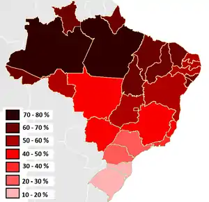 De acuerdo con cifras dadas a conocer por el Instituto Brasileño de Geografía y Estadística en 2009,[53] de los diez estados brasileños con la mayor población de color marrón, cinco estaban en la región del Norte y cinco en el noreste: