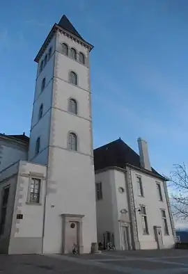 La torre contigua al Parlamento es, por su parte, un vestigio de la antigua iglesia de San Martín de Pau.[4] Este es el campanario de esta iglesia destruida en 1884 para dar paso a una iglesia más grande al este de este sitio. El campanario de la iglesia ya había sido demolido hasta el primer piso en 1794, luego fue reconstruido en madera en 1805 antes de ser completamente reconstruido alrededor de 1870 durante la construcción de la nueva iglesia. Este antiguo campanario ahora se considera a menudo la torre del Parlamento de Navarra.