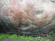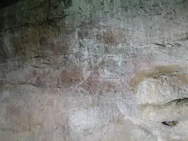 - Las eflorescencias salinas (depósitos de sales), dan lugar a halos blanquecinos, que se depositan en la superficie de la piedra, tras un proceso de infiltración, capilaridad y perdida de agua de cristalización. Estas dificultan la lectura y provocan a futuro por endurecimiento, exfoliaciones y desprendimientos con la consecuente perdida de las pictografías. Es causada tanto por acción natural del escurrimiento de agua, como por la práctica común de humedecer los pictogramas para hacerlos visibles.