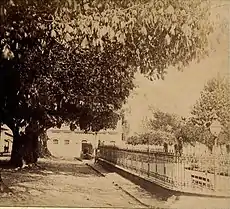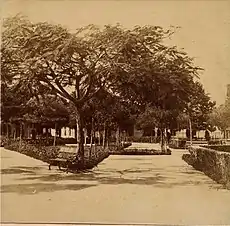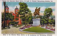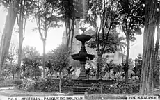 ![]() ![]() ![]() ![]() Parque de Bolívar a principios de 1900, se ve la verja de hierro, la fuente de bronce (en rojo), las torres del Templo de la Candelaria (en verde) que era la catedral en esa época, y la casa (en azul) del fotógrafo Pastor Restrepo construida en 1860 y que aún existe pero en un estado de deterioro.[7] |