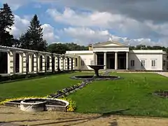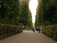 Con la expansión del parque tras la construcción de nuevos edificios, se creó una avenida principal recta de 2,5 km de longitud. Comenzaba al este, en el obelisco de 1748, y con los años se extendió hasta el Palacio Nuevo. En 1764 se construyó la pinacoteca, seguida por las Cámaras Nuevas en 1774. Estos edificios flanquean el palacio y abren la avenida a rotondas con fuentes rodeadas por estatuas de mármol. Desde allí salen varios caminos entre setos altos hacia otras partes de los jardines.