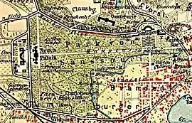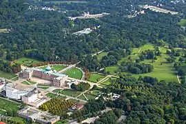 ![]() Vista aérea del parque: el Nuevo Palacio (de frente), el Palacio de la Orangerie (al fondo, centro) y el Palacio de Sanssouci (al fondo, dcha.) | ||