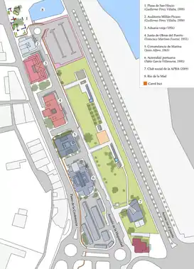 La Avenida de la Hispanidad marca el límite entre la ciudad y la entrada sur del puerto, en ella se encuentra la sede de la Autoridad Portuaria, el vicerrectorado del Campus Bahía de Algeciras, las Aduanas, la sede de Sestibalsa, la Comandancia Militar de Marina o el Auditorio Millán Picazo. En el extremo sur del parque se sitúa desde 2008 la sede social de los trabajadores de la Autoridad portuaria, un edificio diseñado por los arquitectos Emilio Rivas y Rafael Otero.[2]