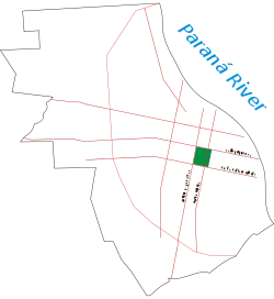 Se encuentra en el centro geográfico de la urbe, delimitado por calle Moreno y tres importantes avenidas: Avenida Pellegrini, Avenida Ovidio Lagos y Bulevar 27 de Febrero. Está atravesado de sur a norte por el Bulevar Oroño. Tiene una superficie de 1,26 km² e incluye:
