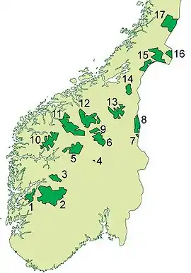 ![]() Mapa de los parques nacionales en la zona sur de Noruega; el Blåfjella-Skjækerfjella es el número 15. | ||