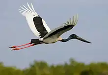 Cigüeña de cuello negro (Ephippiorhynchus asiaticus) en vuelo. Fotografiada en el río McArthur del Norte de Australia. Conocida localmente como Jabiru.