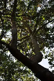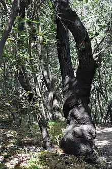 - Principalmente localizado en las laderas suroeste y oeste del cerro La Campana y del Cajón Grande, en pendientes variables y en altitudes de entre 350 y 1000 m s. n. m.. Se trata de zonas con luz, pero baja incidencia de radiación solar directa, al tiempo que la humedad necesaria para esta vegetación se ve favorecida por las neblinas costeras. El bosque se compone principalmente de árboles perennes. La población arbustiva es, en cambio, más bien escasa y en el estrato herbáceo hay gran cantidad de helechos y enredaderas, donde destaca la presencia de parrilla blanca (Proustia pyrifolia). Dentro de la misma comunidad vegetal se han clasificado dos variantes: una que integra al matorral de Retanilla trinervia y de Gochnatia foliolosa con Solenomelus pedunculatus, y una variante que incorpora, en las condiciones de mayor humedad del sector de Ocoa, a Jubaea chilensis, conformando el denominado «bosque esclerófilo de peumo y boldo con palma chilena».[34]