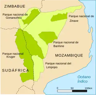 Administrativamente, el parque se divide entre el distrito de Chicualacuala (6.400 km²), el distrito de Massingir (2.100 km²) y el distrito de Mabalane (1.500 km²).[1] El parque forma parte del parque transfronterizo del Gran Limpopo, un parque de la paz de 35.000 km² que une este parque, el parque nacional Kruger en Sudáfrica, el parque nacional de Gonarezhou, el Santuario Manjinji Pan y la zona de safari Malipati en Zimbabue, así como la zona entre Kruger y Gonarezhou, la tierra comunal Sengwe en Zimbabue y la región de Makuleke en Sudáfrica.[2]