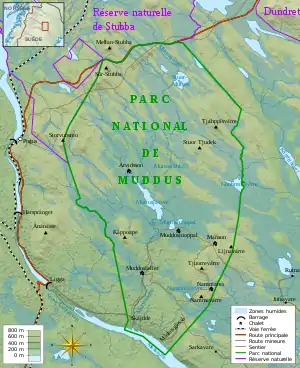 ![]() Mapa de los parques nacionales de Suecia. El número 6 corresponde al parque nacional Muddus | ||
