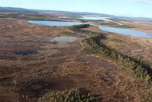 Algunos humedales también son boscosos, a menudo en transición hacia zonas más secas.[M 10] Estos bosques suelen estar formados por árboles pequeños, la mayoría de las veces abedules y abetos, pero a veces también alisos blancos (Alnus incana), sauces de pantano o fresnos de montaña. A continuación, el sotobosque se cubre con arándanos, arándanos rojos (Vaccinium oxycoccos), algodoncillo (Eriophorum vaginatum) y musgo esfagno. En algunos de estos bosques abundan, en particular, las frambuesas árticas (Rubus arcticus), las zarzas de roca (Rubus saxatilis), el parisette de cuatro hojas (Paris quadrifolia), la parnassia de los pantanos (Parnassia palustris) y la ulmaria (Filipendula ulmaria).
