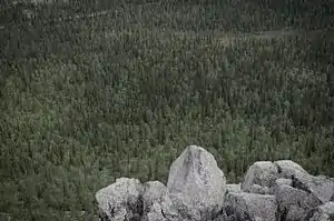 El equilibrio entre pinos y épicéas está dictado por varios factores. Primero, a diferencia del épicéa, el pino es capaz de desarrollarse incluso sobre suelos muy pobres y muy secos y es pues mayoritario sobre los terrenos difíciles.[M 7] En segundo lugar, en la ausencia de incendio, los épicéas se desarrollan y dominan progresivamente el bosque, que reemplaza los pinos, cuyos acaba por no quedar que algunos individuos aislados. Pero los incendios eliminan más bien a los épicéas que a los pinos, y estos últimos son también los primeros en recolonizar los terrenos quemados. Los terrenos que han quemado recientemente son pues dominados por los pinos, mientras que aquellos que queman raramente están dominados por las epiceas. Los incendios son un acontecimiento relativamente frecuente. Habría tenido al menos 47 incendios en el parque entre 1413 y 1984, y en mediana, una zona de bosque quema todos los 110 años, con sin embargo de la variac. local.[8] Los rastros de incendio son visibles, tales que de los cicatrices sobre los árboles que han resistido. El último incendio en el parque tuvo lugar en verano 2006, en la parte sur del parque.[9] Los pinos no son la única especie vegetal que se beneficia de los incendios, las semillas del geranio lanudo (Geranium lanuginosum) por ejemplo pueden sobrevivir en el suelo pendiente de las decenas de años para reactivarse después de un incendio, la planta que tiene necesidad de un terreno despejado para desarrollarse.[O 3]