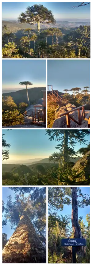 ![]() De arriba hacia abajo y de izquierda a derecha: Vista desde el mirador Piedra del Águila hacia el este, vista de una Araucaria araucana en el mirador Piedra del Águila, vista hacia el mirador Piedra del Águila, Araucarias en el mirador Piedra del Águila, Tronco de una Araucaria araucana, Ñirre (Nothofagus antarctica) en el parque. | ||