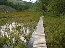 Sin embargo, el bosque caducifolio sólo cubre 42 hectáreas, apenas más del 1,4% de la superficie del parque.[9] Por tanto, el bosque es principalmente de coníferas, característico de la ecorregión de la taiga escandinava y rusa.[S 15] Este bosque está formado principalmente por píceas (Picea abies), pero en la frontera con las zonas áridas, la especie principal es el pino silvestre (Pinus sylvestris).[V 1] Los pinos dominan porque los incendios forestales son menos frecuentes que antes, ya que el abedul y el pino silvestre son las primeras especies que vuelven a crecer después de un incendio.[H 7] Parece que los incendios se produjeron de forma natural a lo largo de la historia, pero no ha habido ningún incendio desde hace dos siglos, ya que los humanos luchan activamente contra su propagación.[H 7] La edad máxima de los árboles del bosque es de 100 años, pero algunos pinos han llegado a los 500 años, siendo especialmente inaccesibles y, por tanto, salvados de los madereros.[H 7] Sin embargo, en los últimos 100 años, el bosque ha recuperado parcialmente la riqueza que caracteriza a los bosques antiguos.[H 8]
