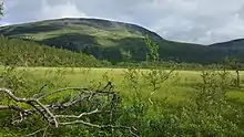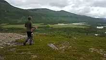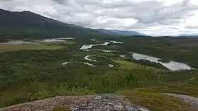 - Vádvečohkka (derecha) y el profundo valle de Vádvejohka visto desde el sur en abril.