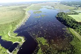 En las aguas abiertas se encuentra el nenúfar amarillo, en cuyas hojas en forma de corazón pueden verse zapateros y escarabajos del nenúfar amarillo (Galerucella nymphaeae), que se comen las hojas. destaca la abundancia de libélulas, el mayor depredador de los insectos.