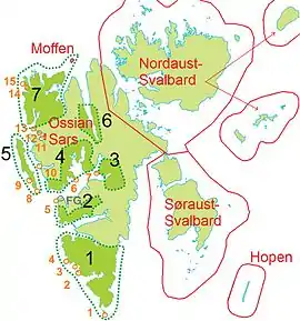 ![]() El número 3 es el Parque nacional de Sassen–Bünsow Land en la isla de Spitsbergen. | ||