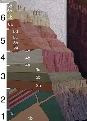 5 - Grupo de Supai 5d - Formation de la Explanada 5c - Formación de Wescogame 5b - Formación de Manakacha 5a - Formación de Watahomigi 4 - Temple Butte, Redwall y Surprise Canyon 4c - Formación de Surprise Canyon 4b - Caliza de Redwall 4a - Caliza de Temple Butte 3 - Grupo de Tonto 3c - Caliza de Muav 3b - Esquisto de Bright Angel 3a – Arenisca de Tapeats 2 - Supergrupo de Gran Canon 1 - Grupo de Vishnu 1b - Granito de Zoroastro 1a - Esquisto de Vishnu
