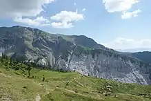 El parque natural Korab-Koritnik comienza en la frontera con Kosovo en el norte a lo largo de la frontera con el norte de Macedonia hasta las montañas Desha en el sur. El parque natural lleva el nombre de las montañas Korab y la montaña Koritnik. El Korab es la cumbre más alta de Albania y Macedonia del Norte, con una elevación de 2.764. También es una de las dos cumbres más altas de Europa, que es el punto más alto de más de un país y también es la decimoctava cumbre de montaña más elevada de Europa. [5] [6] La cumbre es un macizo montañoso muy resistente y se compone principalmente de esquisto y piedra caliza del período Paleozoico con estructuras de bloques y también rocas de yeso severamente dañadas del permo Triásico . En el lado oeste, la montaña cae abruptamente con paredes de roca, mientras que el lado norte está formado por rocas escarpadas. [2]