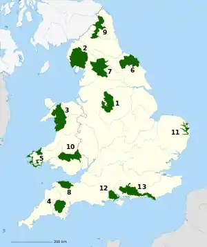 Los Parques nacionales del Reino Unido son áreas controladas de paisaje sobresaliente donde las actividades de poblamiento y comerciales se encuentran restringidas. Casi todo el terreno en los parques nacionales del Reino Unido es de propiedad y administración privadas. Hay 14 parques nacionales en el Reino Unido en la actualidad, de los cuales 9 están en Inglaterra abarcando el 7% del territorio inglés y 3 en Gales cubriendo alrededor del 20% de la zona terrestre de Gales.