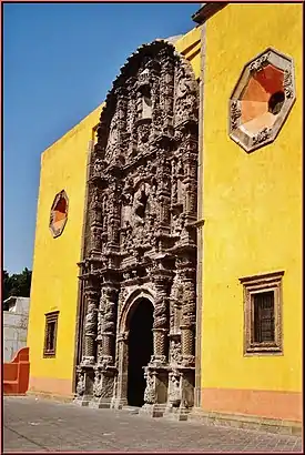 Su fachada muestra no sólo el estilo churrigueresco o mejor llamado ultrabarroco, sino que es todo un muestrario de las variantes del barroco, desde el salomónico hasta el estípite. El edificio nos habla de que tuvo varias etapas constructivas y que seguramente nunca fue concluido, por eso sólo cuenta con una torre-campanario. Los detalles decorativos de su portada (o fachada) son maravillosos, con un acabado impresionante de la cantería. Actualmente[¿cuándo?] se encuentra en restauración.