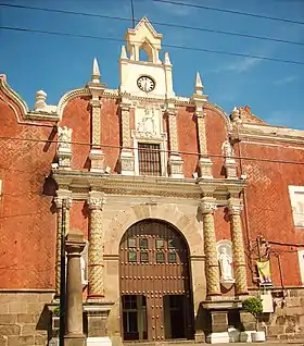 Muestra una colorida portada con columnas, friso y pilares tapizados con azulejo de talavera poblana. Su única torre de dos cuerpos y remate octagonal, está a su vez revestida de ladrillo, como la anexa Casa de ejercicios. Su atrio conserva aún los pilares que antaño estuvieran en el atrio de la Catedral. El esbelto campanario se ubica en una esquina.