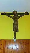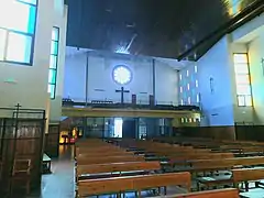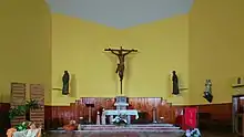 La iglesia alberga una capilla mayor compuesta por las imágenes en madera de Cristo crucificado, la Virgen María y San Juan, obra de los escultores Acisclo Manzano y Manuel Buciños;[1][4] Manzano elaboró la talla de San Juan mientras que Buciños realizó la imagen de la Virgen, siendo el Cristo obra de ambos. Estas imágenes constituyen prácticamente la única decoración de la capilla mayor, la cual destaca por su austeridad, acorde a los postulados del Concilio Vaticano II además de ser un reflejo del gusto de los años 1960 por la simplificación ornamental, lo que al mismo tiempo permitió la reducción de gastos, habiéndose descartado desde el principio la instalación de un retablo dado el gran desembolso económico que hubiese supuesto cubrir el muro situado tras el altar mayor de la iglesia,[2] la cual posee una única nave de planta rectangular, falso techo de madera, sacristía y varias capillas adosadas.