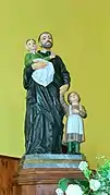 A la derecha, próximo al altar mayor, se encuentra una imagen de escayola de San Pío X, regalo de las monjas del Colegio Santo Ángel al párroco Antonio Vázquez Borrajo con motivo de la inauguración del templo, mientras que frente al mismo, a izquierda y derecha respectivamente, destacan una imagen de San Vicente de Paúl y una talla de madera de la Virgen del Rosario, esta última fechada a finales del siglo xviii o principios del xix y adquirida a un anticuario (tras su compra fue restaurada y se le añadió una corona de plata). A ambos lados de la puerta de entrada, directamente bajo la tribuna (de planta rectangular y pocos ornamentos al igual que el resto del templo), se hallan a su vez dos pequeños espacios protegidos con rejas; en el de la izquierda se ubica una imagen del Cristo del Dolor (de inspiración medieval y procedente de un anticuario al igual que la talla de la Virgen del Rosario), mientras que en el de la derecha, tras una reja y un cristal, se custodia una talla del Sagrado Corazón.