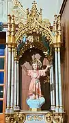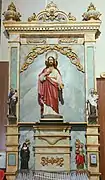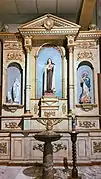 En el muro frontal de la nave del evangelio destaca un retablo neoclásico de un cuerpo y tres calles rematado con jarrones en los extremos y un frontón sobrebajado en el centro, sostenido por columnas de fuste liso (salvo dos molduras en la mitad inferior) apoyadas sobre basas y rematadas por capiteles corintios. Este retablo está presidido por una imagen de Santa Teresa de Lisieux la cual es sacada en procesión durante su festividad, mientras que a derecha e izquierda, bajo sencillos arcos de medio punto, hay imágenes de la Inmaculada Concepción y la Virgen de Lourdes acompañada de Santa Bernardita Soubirous (estas dos últimas realizadas en cerámica o porcelana esmaltada), hallándose frente al mismo una pequeña pila bautismal y, en el muro lateral, una talla de la Virgen de Fátima bajo un arco apuntado. Por su parte, en el muro frontal de la nave de la epístola se ubica un retablo de menor tamaño y mayor simpleza ornamental el cual muestra en el centro una talla del Sagrado Corazón y en los extremos, frente a sencillas pilastras coronadas por jarrones, pequeñas estatuas de San Antonio de Padua y la Virgen del Carmen, mientras que en la parte inferior se encuentran las imágenes de Santa Rita de Casia y Santa Lucía de Siracusa. A la derecha se sitúa una puerta que conduce a la sacristía, junto a la que destacan un cuadro de la Divina Misericordia y un camarín rematado por arcos conopiales polilobulados y presidido por una talla del Divino Niño.