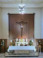 El interior, de planta rectangular con cubierta a base de una combinación de vigueta y hormigón formando un bloque uniforme a prueba de incendios,[1] presenta, tras un arco peraltado, una sencilla y austera capilla mayor de base trapezoidal presidida por un Cristo crucificado sobre un panel rectangular de madera, hallándose la mitad inferior de los muros del templo cubiertos también con madera. A ambos lados de la imagen de Cristo se encuentran una talla de la Virgen Milagrosa y una estatua de San José a izquierda y derecha respectivamente, situándose en el centro, bajo la imagen de Cristo crucificado, un sagrario custodiado en los extremos por las esculturas de dos ángeles.
