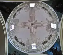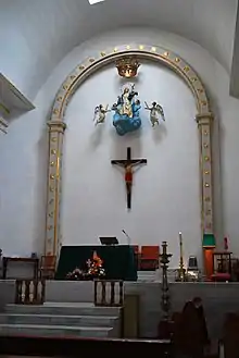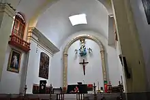 El recinto del presbiterio está dividido por dos hileras de cuatro pilares, en tres espacios en sentido del eje del templo, a semejanza de tres naves, de las que la central se cubre con bóveda de cañón seguido.[1] Las naves laterales tienen cubierta de bóveda plana más baja que la de la central.[1] El presbiterio se halla sobre una plataforma de 1.50 m de altura, con piso revestido de madera, con una escalinata central de seis escalones.[1] El templo recibe luz por cuatro ventanillas circulares del lado del Evangelio; tres iguales del lado de la Epístola;[1] por las cuatro ventanas de la cúpula que cubre el crucero; por el tragaluz de la navecilla central del presbiterio y por la puerta y ventana de la fachada.[1]