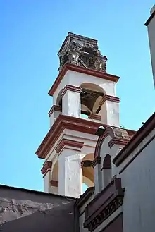 La fachada del templo ve al poniente, la puerta es un vano con cerramiento de medio punto con arquivolta moldurada, y decorada la clave con un escudo pontificio.[1] Encuadran el vano dos pilastras unidas en su parte superior por un cornisamento, arriba del cual se abre una ventana cuadrangular que da luz al coro y se corona por un frontón triangular.[1] A la derecha de la fachada parroquial destaca el campanario cuadrangular, que constituye la base de una torre que fue demolida y que no llegó a restaurarse.[1] Se le practicaron vanos con cerramiento de medio punto de sus cuatro costados y se cubrió con envigado y terrado; aloja cinco campanas.[1]
