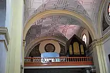 El coro ocupa el primer cuerpo de la nave y es un tapanco de madera sostenido por viguetas transversales; en este espacio existen dos altares laterales.[1] El segundo cuerpo solo tiene un nicho en cada lado y una puerta que comunica a la capilla anexa.[1] El cuerpo siguiente corresponde al crucero, que se cubre con una cúpula semiesférica sin tambor y con pechinas.[1] El cuerpo siguiente, anterior al presbiterio, tiene bóveda de arista con nervaduras.[1] El espacio anterior al presbiterio tiene dos balcones altos laterales que dan a un pequeño patio por el norte y a una de las habitaciones de la casa cural por el sur.[1] Por el lado de la Epístola, una puerta cuadrangular da comunicación al antiguo cuadrante que hace las veces de pasillo entre el brazo sur de la cruz y la Sacristía.[1]