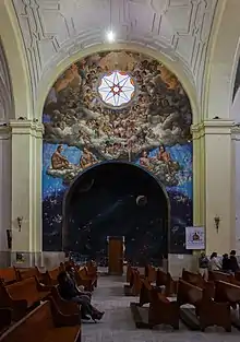 En 1972 se emprendió un proyecto de Jesús Becerril Martínez, para la pared del altar principal que quedó inconcluso.[8][9] En la parte superior representó a los ángeles rodeando a la virgen, y comenzó a pintar un monumental Cristo resucitado, pero los ángeles desnudos, provocaron protestas, lo cual llevó, a que se suspendiera el trabajo.[8][9] Becerril manejaba la pintura sobre tela, fue así que la tela terminada de los ángeles fuera removida hacia el acceso del baptisterio.[8] La tela inconclusa de Cristo, se conservaría guardada por el pintor; hasta que el obispo de Tulancingo, promovió que Becerril realizara su último mural religioso, en el seminario mayor de su diócesis.[8][9]