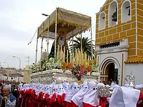 Una puerta con arco de medio punto rematada con una espadaña en la que se encuentran tres campanas da paso a un atrio tras el que se encuentra la puerta de entrada al templo, sobre la que se sitúa un óculo que paso al frontón. En los petos se sitúan cresterías.[1]