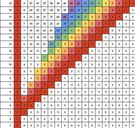 Si damos la vuelta al diagrama de la partición de 6 + 4 + 3 + 1, a lo largo de su diagonal obtenemos la partición de 14.