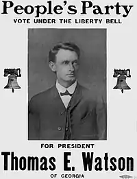 Unos meses después, el 4 de julio, se reunió en Omaha, Nebraska, la Convención Nacional del Partido del Pueblo que nominó como candidato a la presidencia de Estados Unidos a James B. Weaver, de Iowa, antiguo miembros del Partido de los Billetes Verdes.[10][9] Según Philip Jenkins, Weaver se presentó «con uno de los programas más radicales que se hayan visto nunca en unas elecciones nacionales». En él se decía que Estados Unidos estaba al borde de la «ruina moral, política y material» y para remediarla se defendía la jornada de ocho horas, un impuesto progresivo sobre la renta y el control del gobierno sobre los servicios públicos. Asimismo se propugnaba la libertad de acuñación de moneda de plata, como una medida que elevaría los precios beneficiándose de ello los agricultores del Oeste, aunque perjudicaría a la industria y a la banca del Este por lo que los republicanos calificaron esta propuesta de «dinero blando» como «anarquista» y revolucionaria.[11][9] El programa también incluía otros temas populistas como controlar la especulación de la tierra y limitar el poder de los bancos, así como medidas dirigidas a los trabajadores industriales, como la nacionalización de los ferrocarriles y el cese del uso de los detectives de la agencia Pinkerton para reprimir a los huelguistas, y de profundización de la democracia, como la promoción de la iniciativa legislativa popular y los referéndums, la limitación a un solo mandato de los presidentes y la elección directa de los senadores.[10] En las elecciones Weaver consiguió más de un millón de votos populares, que supusieron el 8,5% del total, y 22 votos electorales. [11][9]