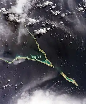 Bajo la superficie del agua hay una línea de arena submarina que enlaza ambos atolones. Por este motivo, el paso a grandes embarcaciones no es accesible. Antaño, este cuerpo de arena sobresalía originalmente del agua.[1]