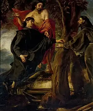 El tema del cuadro no está claro. En el inventario de venta de 1786 se describía la obra como «San Francisco de Asís en una visión donde Cristo le manifiesta a un sacerdote que no quería admitir a voto».[2] Posteriormente se ha sugerido que el joven estudiante o sacerdote que parece caminar sobre las aguas sostenido por Cristo pudiera ser el conde Orlando Cattani, señor de Chiusi della Verna, quien en 1213 cedió a san Francisco de Asís unos terrenos que se convertirían en el lugar en el que el santo recibió los estigmas en 1224.[2] Por ello se ha creído que el tema del lienzo pueda ser la milagrosa presentación del conde Orlando Cattani a san Francisco.[4]