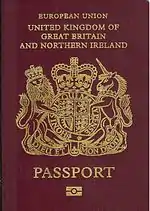 Las palabras "EUROPEAN UNION" se presentan en la parte superior de los pasaportes británicos si se emite a ciudadanos británicos que son considerados "ciudadanos del Reino Unido de Gran Bretaña e Irlanda del Norte bajo el derecho de la Unión Europea" [2] siendo ausentes en los otros pasaportes británicos.