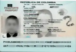 ![]() La página de información de un pasaporte biométrico colombiano (desde 2018). | ||