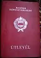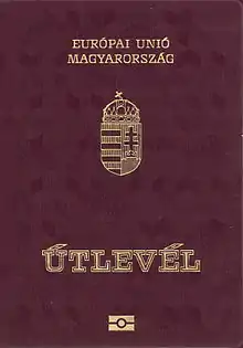 A partir de 2013, los pasaportes húngaros regulares de la UE son de color burdeos (antes de que se usara un color azul marino), con el escudo de armas húngaro estampado en el centro de la portada. Las palabras "útlevél" (pasaporte , o más literalmente, Roadletter) inscritas debajo del escudo de armas y "Európai Unió" (Unión Europea), "Magyarország" (Hungría) arriba. El nuevo pasaporte biométrico húngaro tiene el símbolo biométrico estándar en la parte inferior.