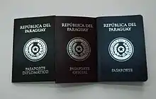 - Pasaporte Diplomático - Expedido a diplomáticos paraguayos, altos funcionarios del gobierno paraguayo y correos diplomáticos.