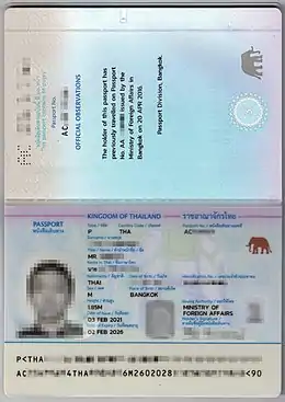 ![]() La página de información de un pasaporte biométrico tailandés (2021). | ||